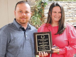 Developer and The Todd House Wedding & Event Center owner Allen Strickland was named Citizen of the Year at Tuesday’s Greater Tabor City Chamber of Commerce banquet, and accepted the Tabor Medal from outgoing chamber President Kandi Dill. (Deuce Niven, TLT)