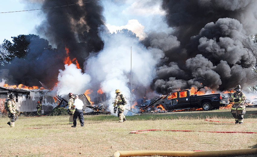 A house, mobile home, storage building, two trucks and more burned near Tabor City Wednesday afternoon. (Deuce Niven, TLT)
