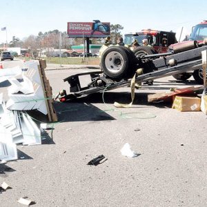 A flatbed truck overturned on US 701 Bypass at Complex Street in Tabor City Monday morning, leaving a pallet full of molding, some damaged, on the pavement. No other vehicle was involved, and the driver suffered an apparent minor injury in the crash, shortly before 11 a.m., said Capt. Christopher Hilburn of the Tabor City…